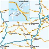 In der Ausfahrt biegen Sie nach rechts ab und folgen der Staatsstrasse ca. 5 km bis nach Geroldsgrün. In der Ortsmitte direkt vor dem markanten Firmengebäude von A.W. Faber-Castell biegen Sie links in den Wiesenweg und nach rund 300 m rechts in den Brunnenweg.